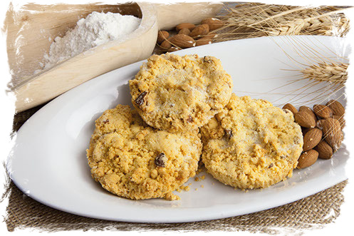 Ingredienti: Farina tipo 00 bianca, farina di mais fioretto, farina di mandorle, burro, zucchero, uova, mandorle grezze tritate, maraschino, lievito chimico per dolci, vaniglia, sale.